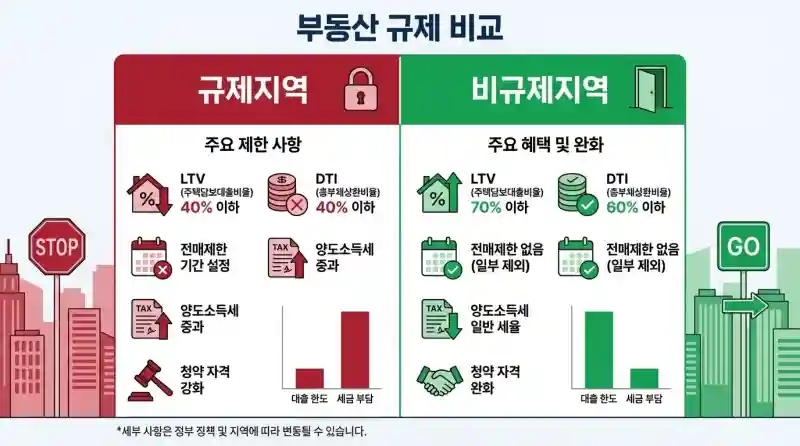 부동산 투자에서 규제지역과 비규제지역의 차이는 단순히 대출 한도만의 문제가 아니에요. 세금, 전매 제한, 청약 자격까지 모든 게 달라지거든요. 🤯