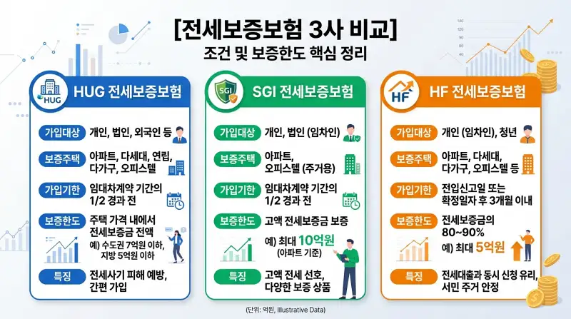 HUG(주택도시보증공사), 한국주택금융공사(HF), SGI서울보증 세 곳이 전세보증금 반환보증 상품을 운영하고 있는데, 가입 조건이 다릅니다. 공통적으로 ‘전세금이 공시가격의 일정 비율(보통 126% 내외) 이내’여야 가입이 가능하고, 집주인이 세금 체납이 없어야 하는 등 조건이 까다로운 편이에요.